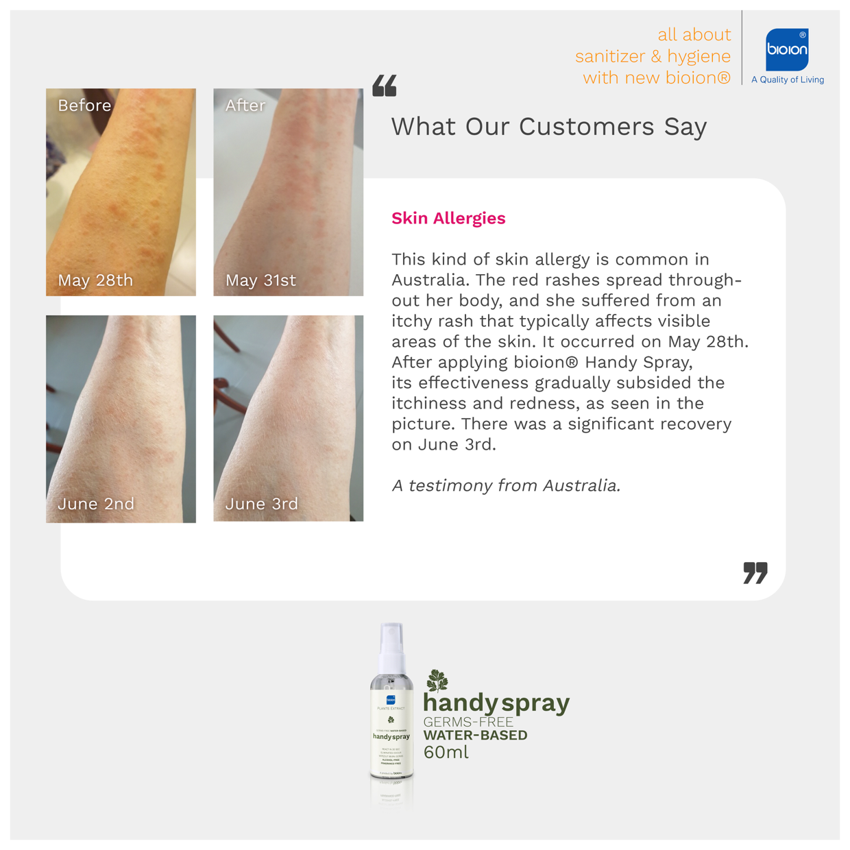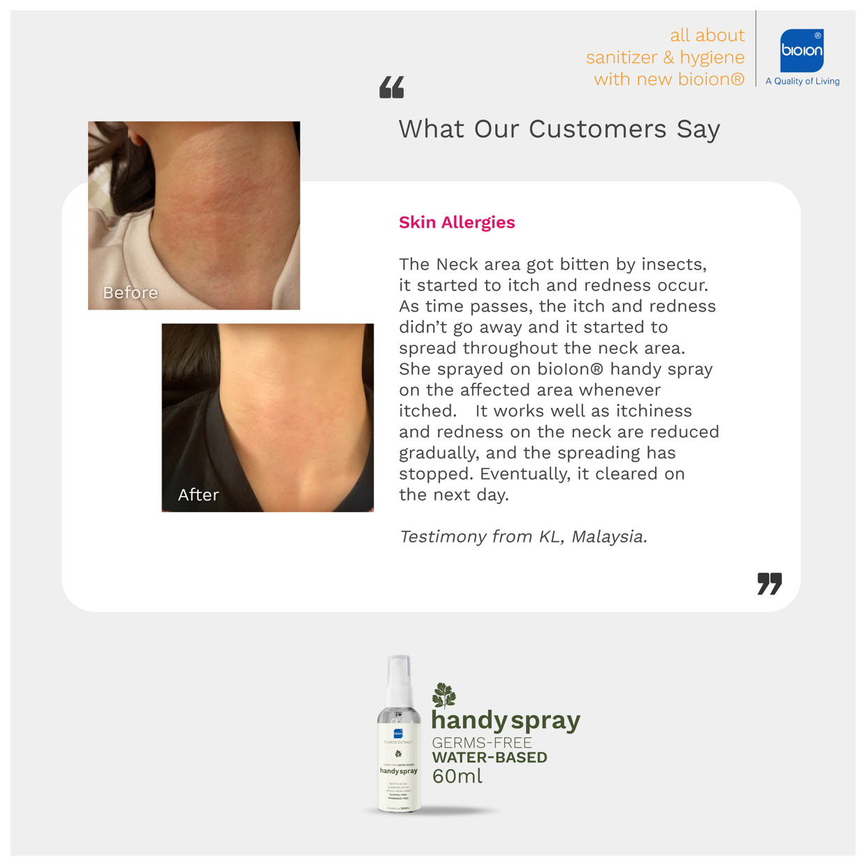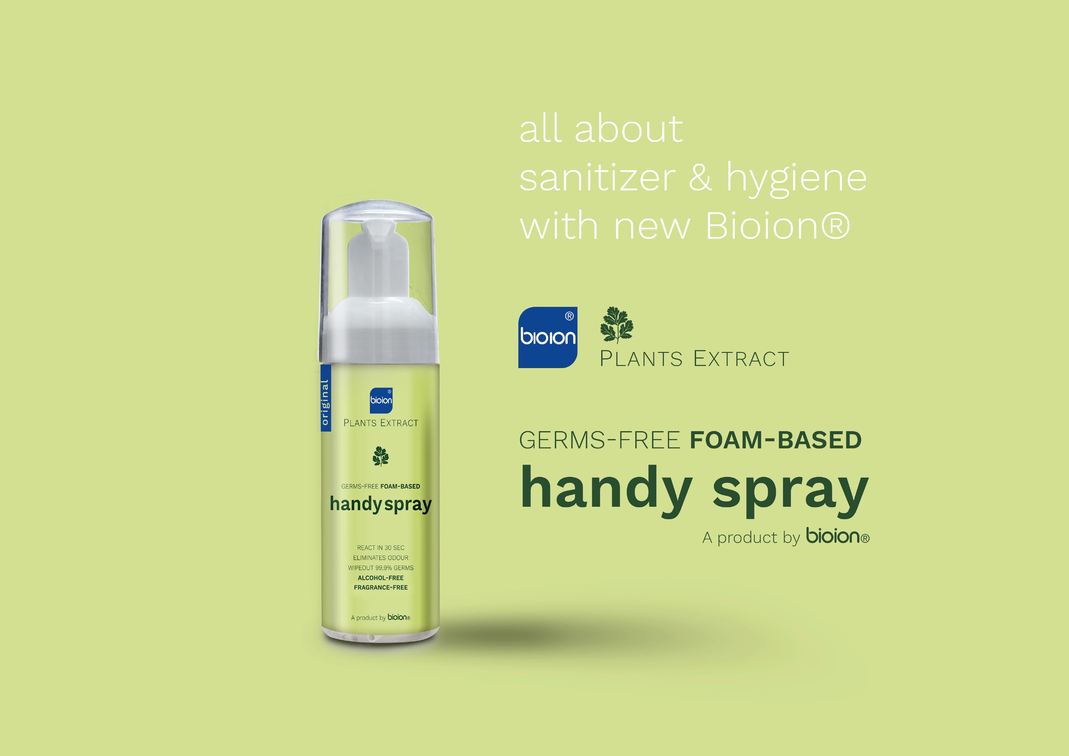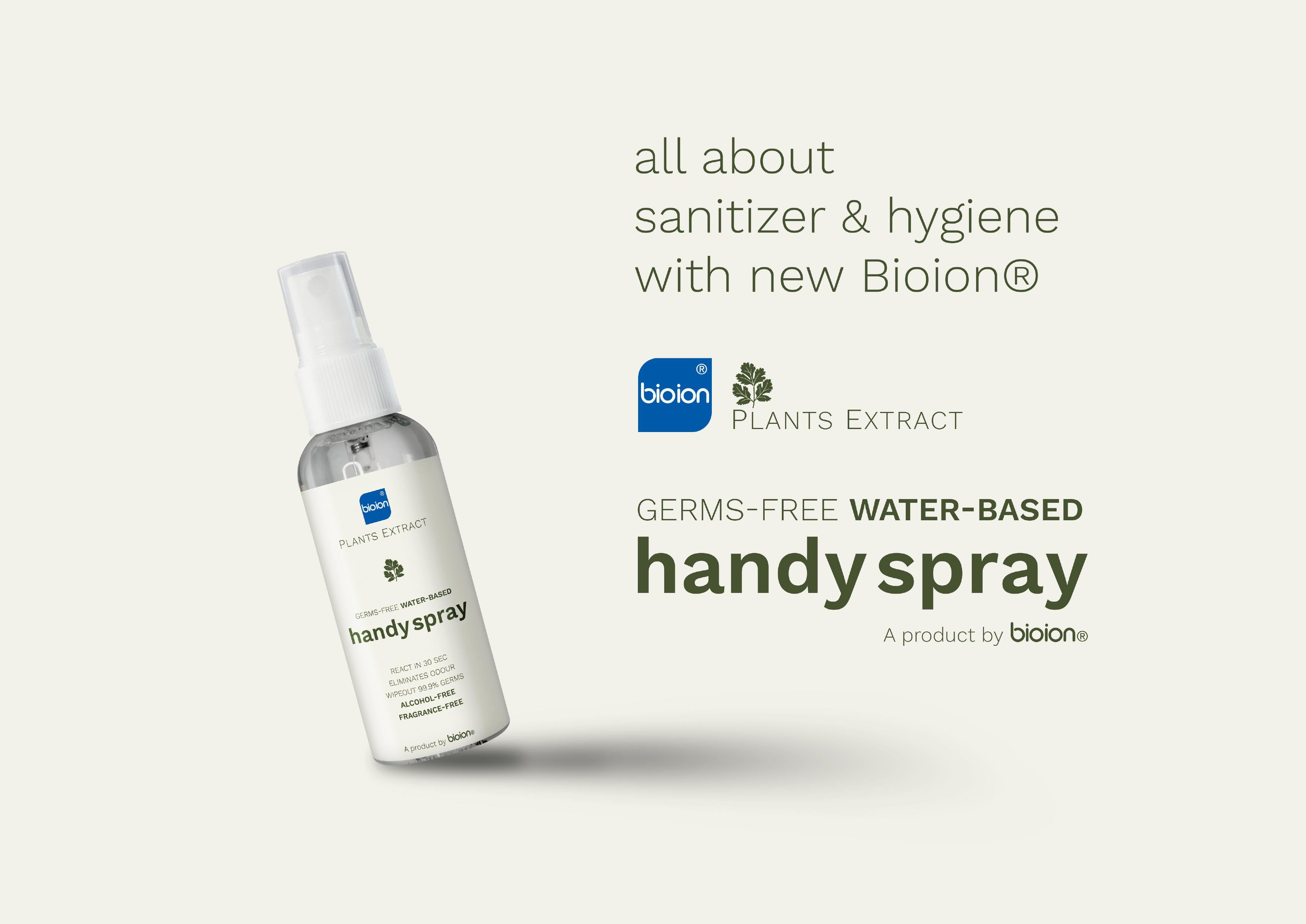 Bioion®️ Handy Spray is a plant-based sanitizer. Created with plant-based properties, it is a sanitizer that caters for everyone, including users with skin sensitivity. On top of eliminating germs, it provides a protective layer to our skin from the harmful germs.